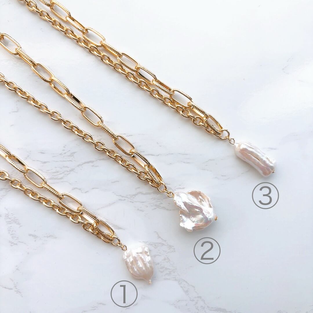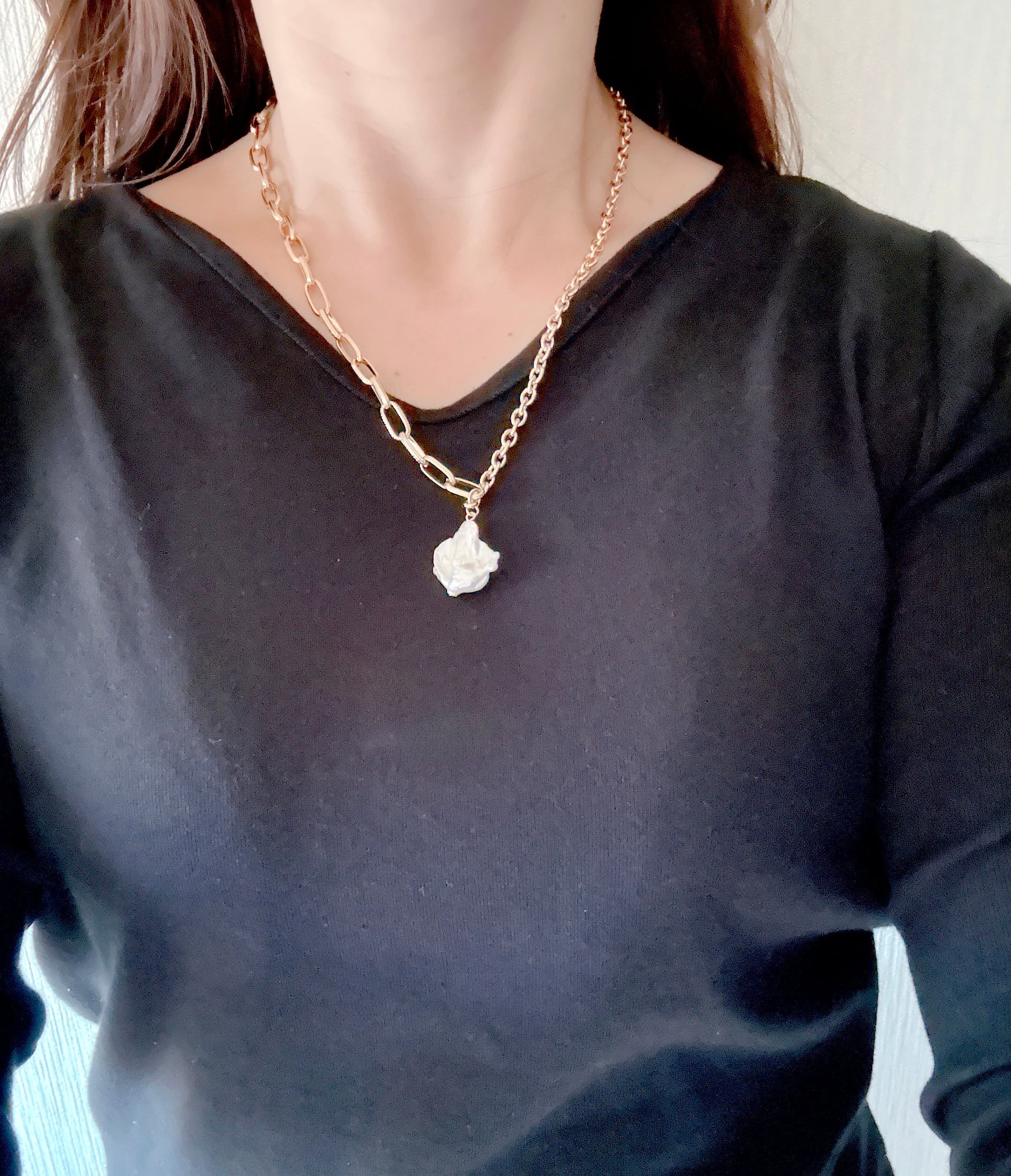 アシンメトリーのチェーンに大きめの一粒淡水パールのトップ。