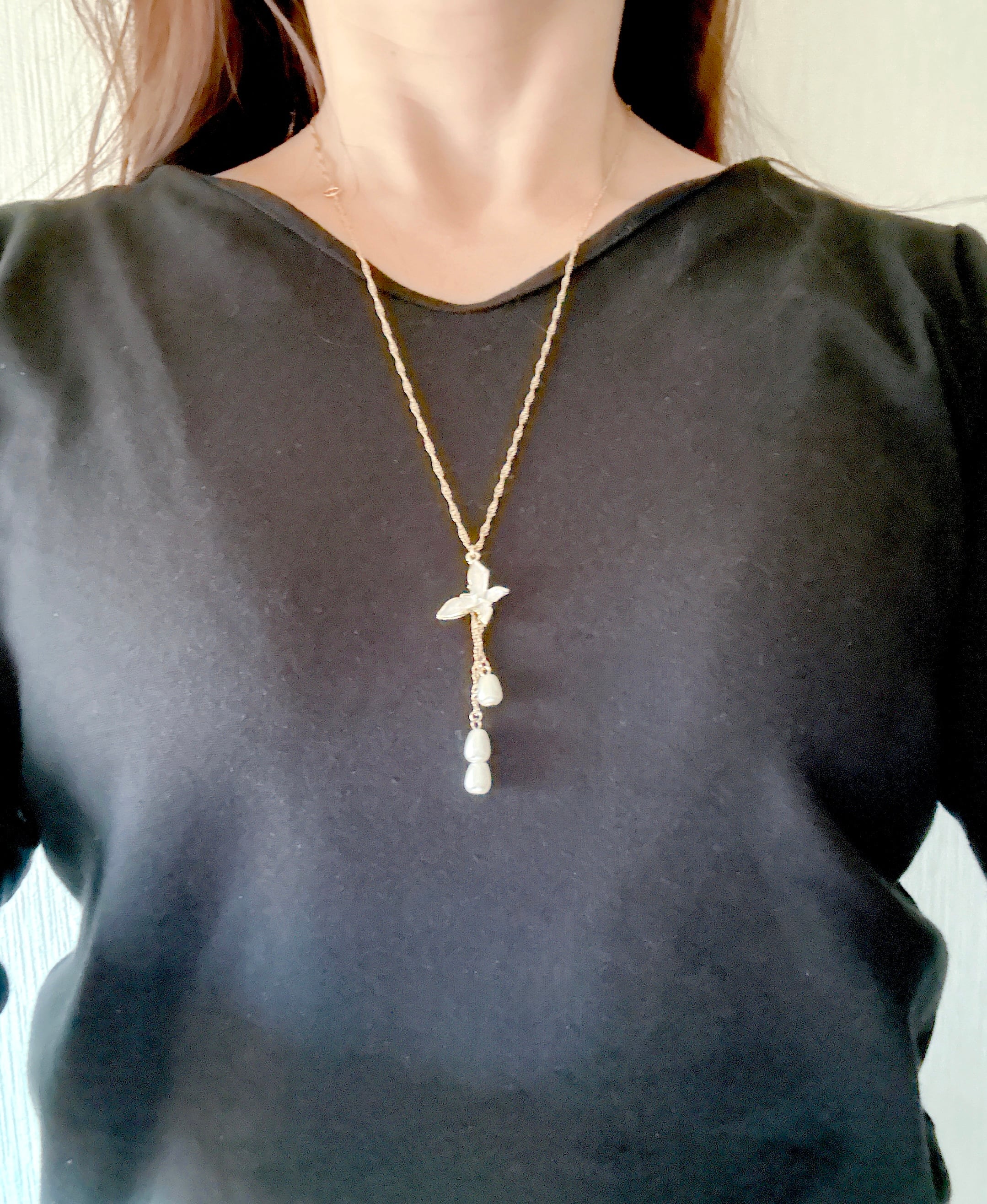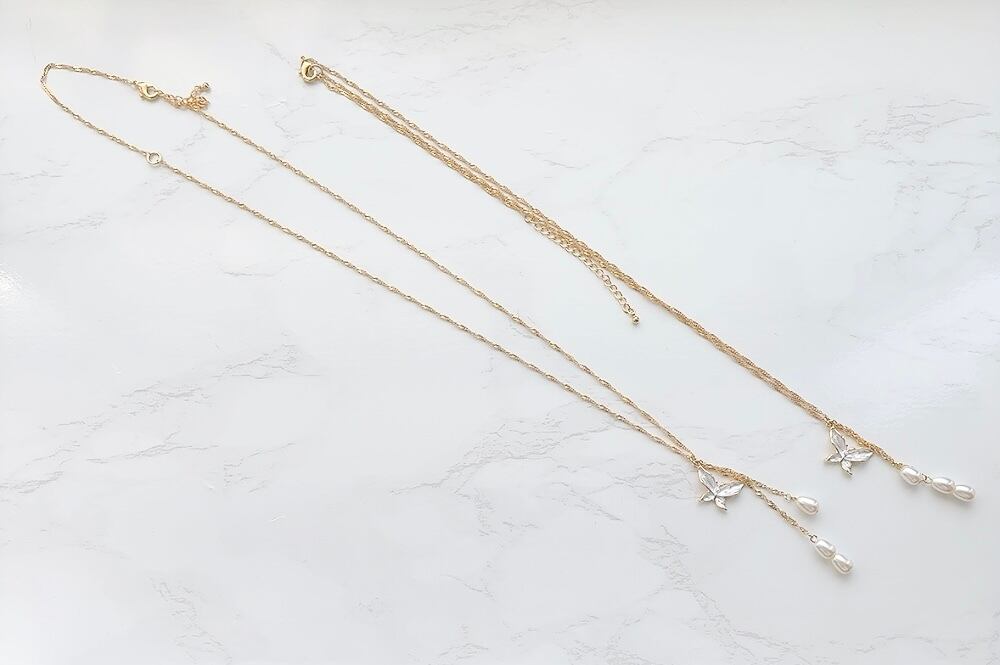 パールのような輝きのあるバタフライチャームトップのネックレス。