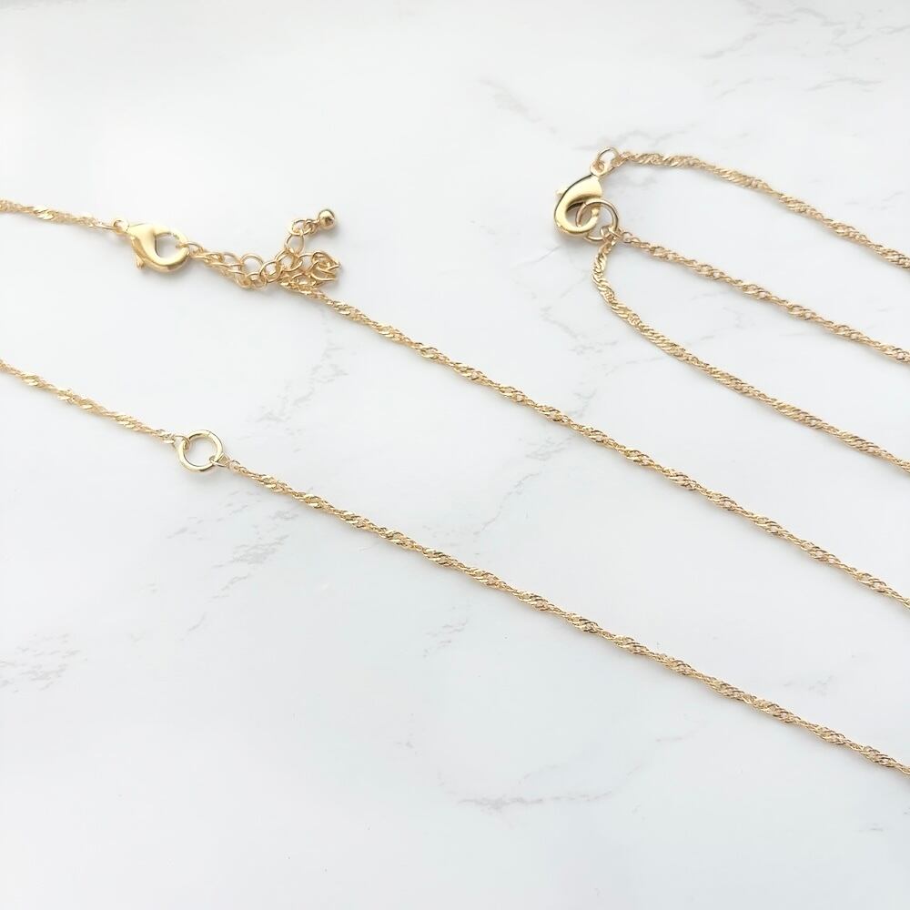 チェーン途中の丸カンを入れ、留める位置を変えることで長さを2段階に調節できるようになっております。