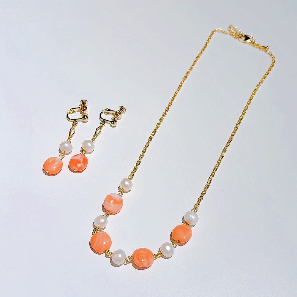 珊瑚のようなビーズと淡水パールの優しい色合いのイヤリング・ピアス。