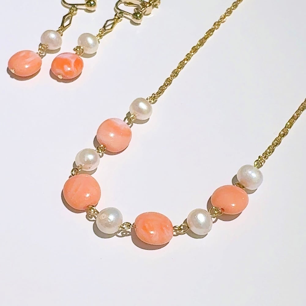 珊瑚のようなコーラルピンクビーズと淡水パールのネックレス。