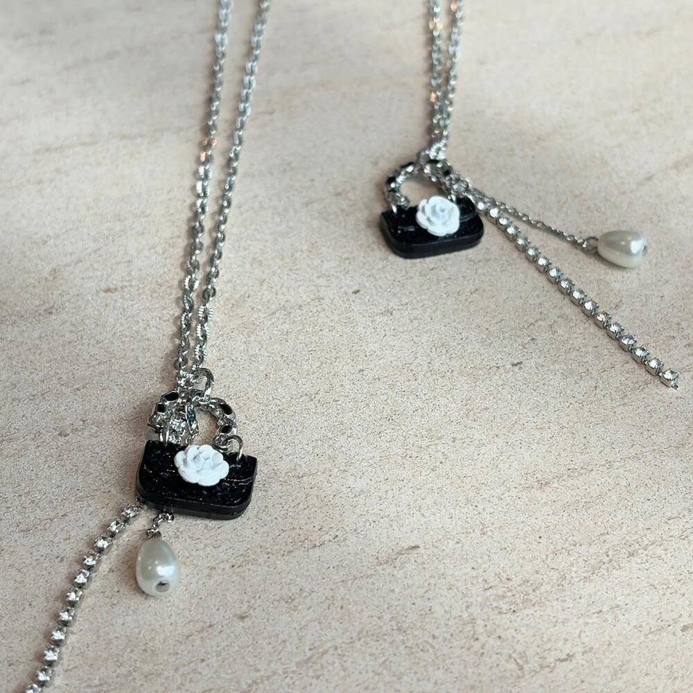 キラキララインストーンチェーンやパールチャームのガーリーな要素が詰まったネックレスです。