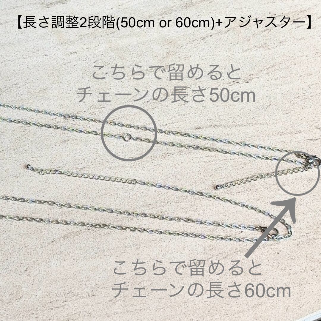 チェーンの長さは、留める位置で2段階調整(50cmと60cm)ができ、便利です。