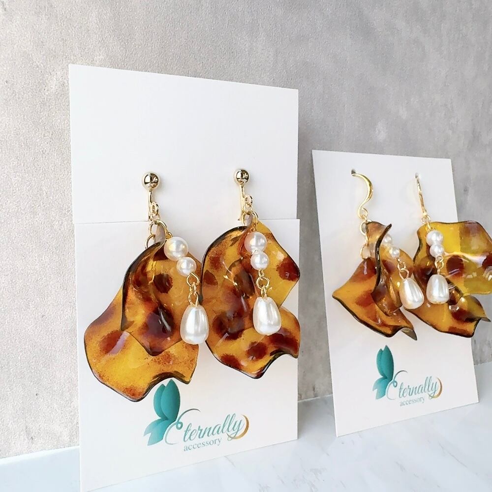 ヒョウ柄べっ甲花びらパーツイヤリング・ピアス