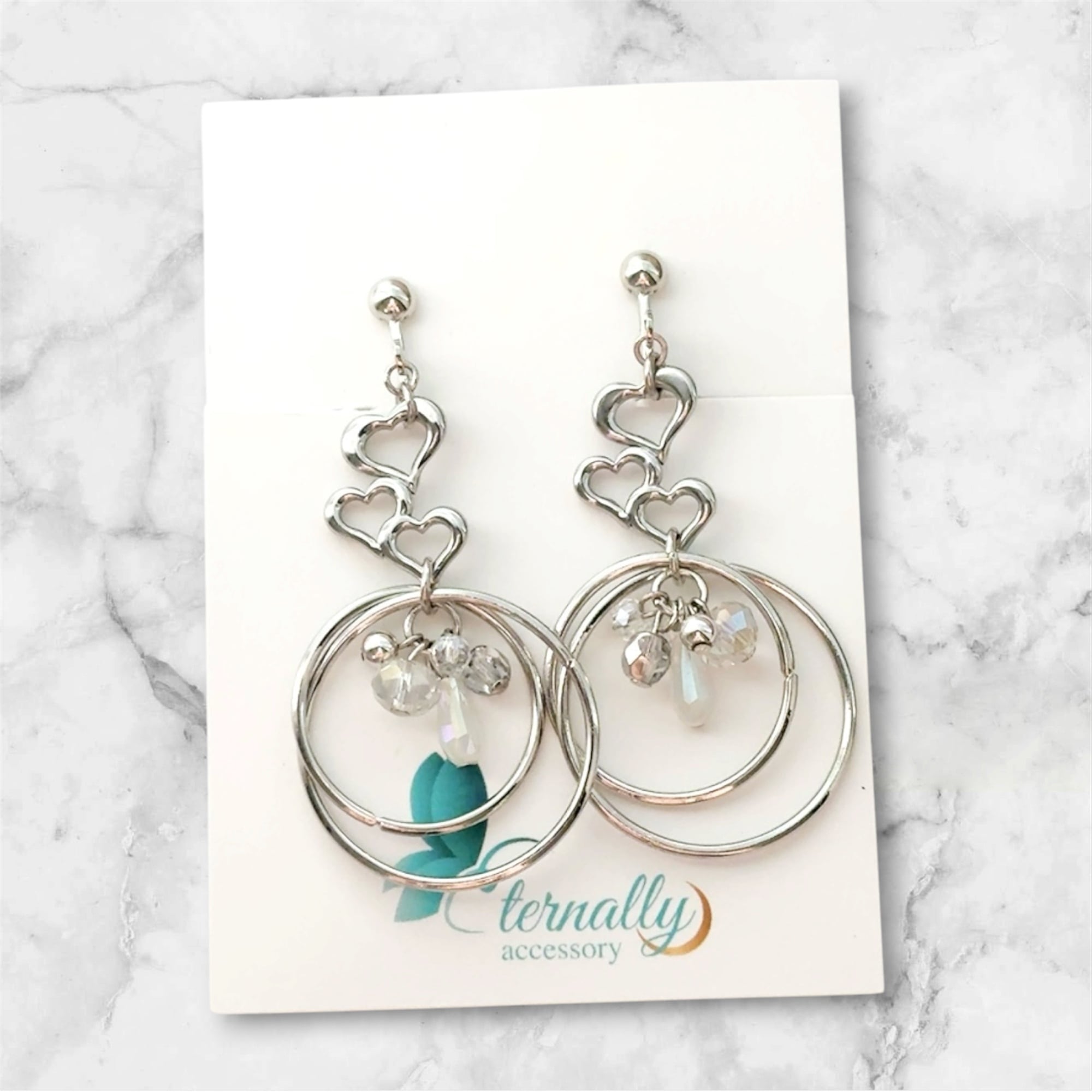 オープンハートチャームと、ボリューム感のあるダブルフープを組み合わせたシルバーアクセサリー。中央でキラキラと揺れるビーズが、まるでお守りのような存在感。