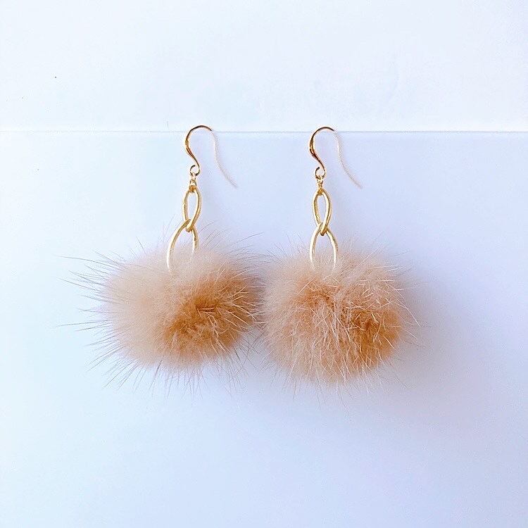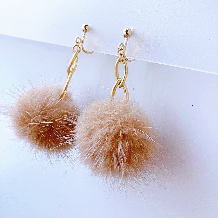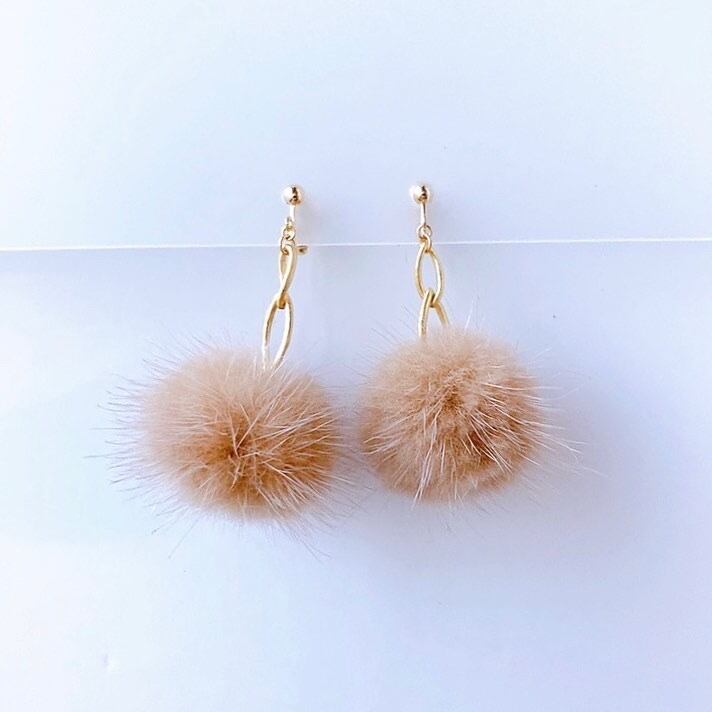 ベージュファーxマットゴールドチャームイヤリング・ピアス