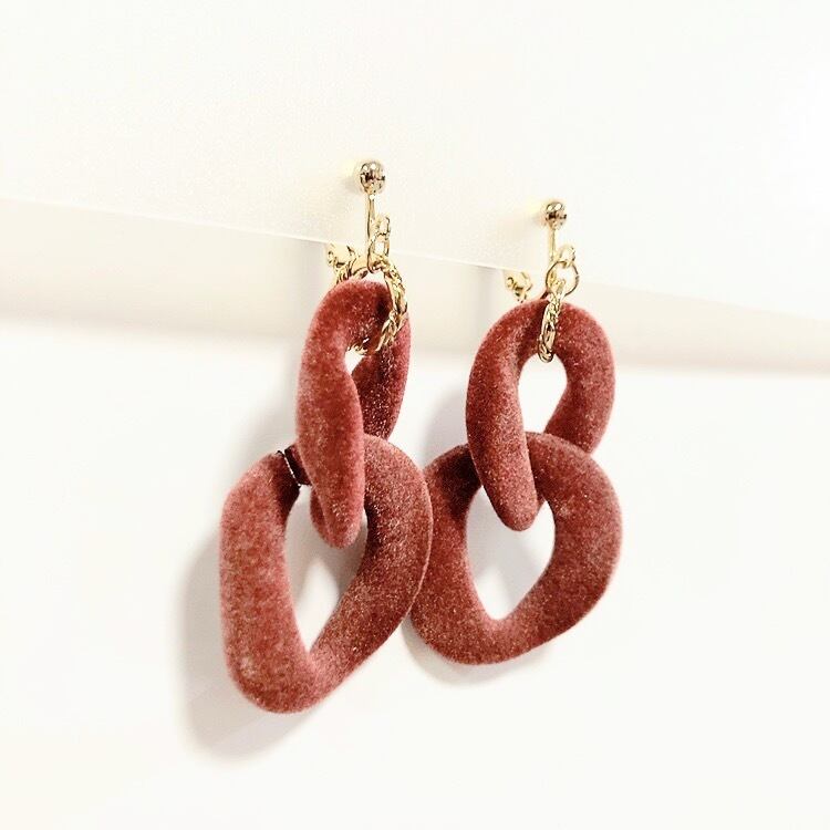 ブラウンピンクベロアWチェーンフープイヤリング・ピアス