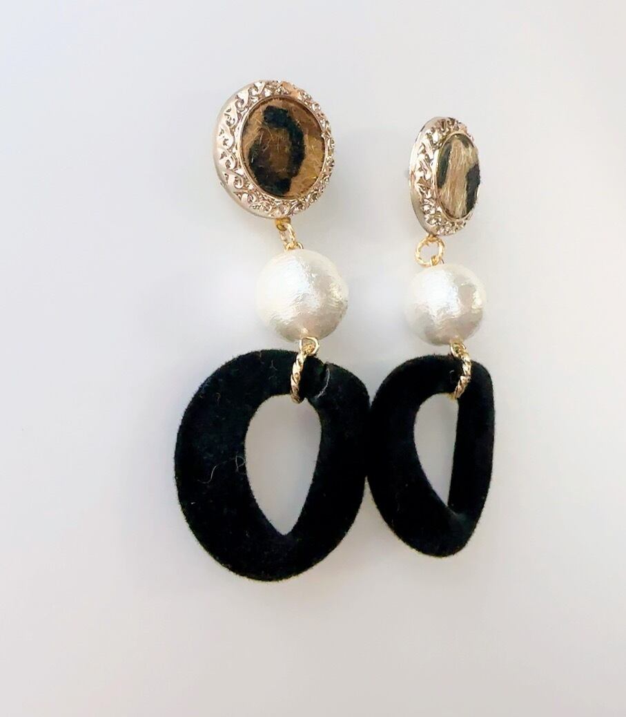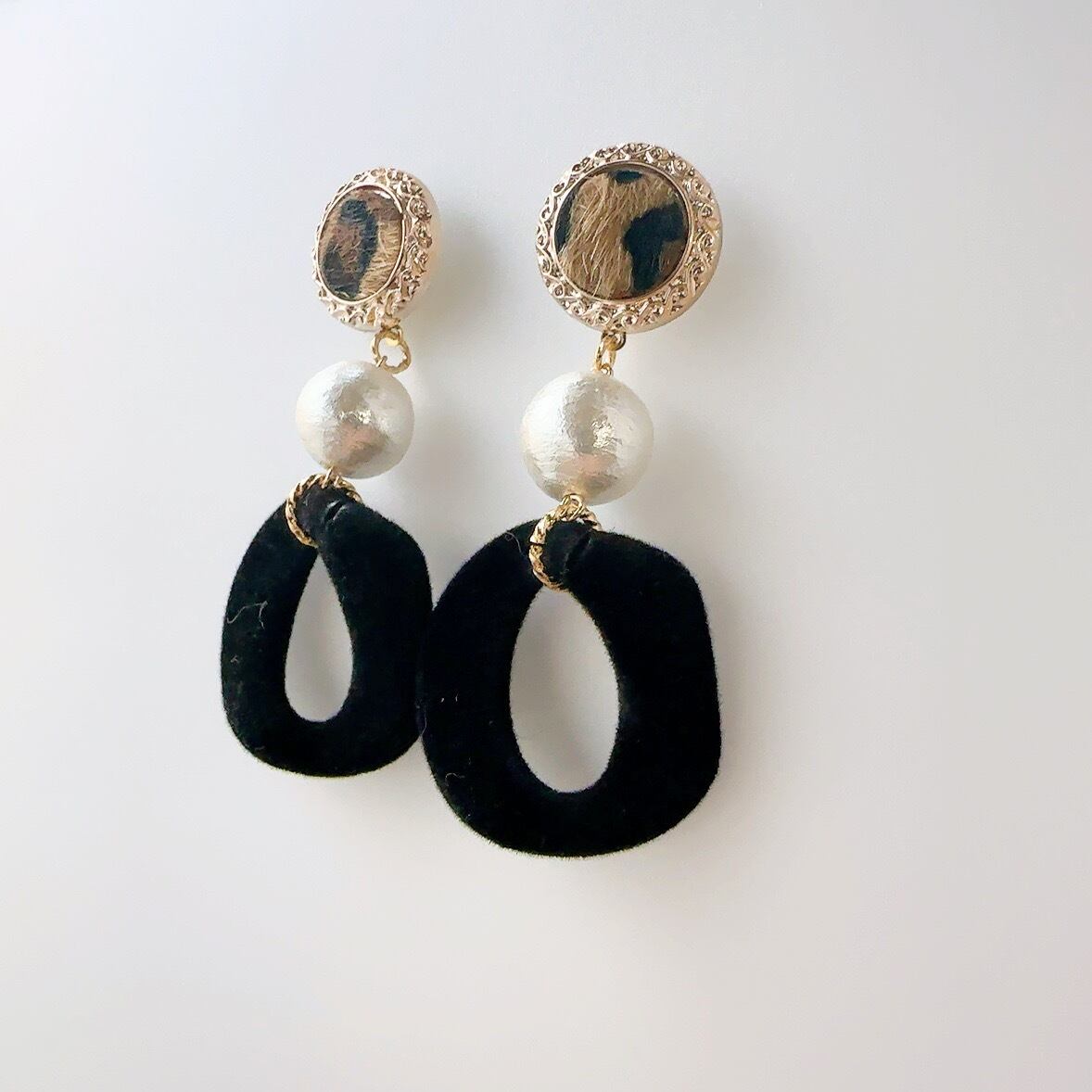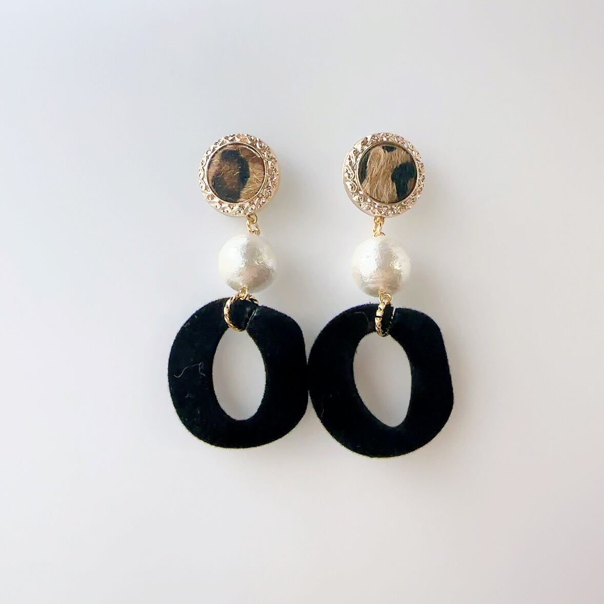 アニマル柄パーツ×パール×ベロアブラックフープイヤリング・ピアス