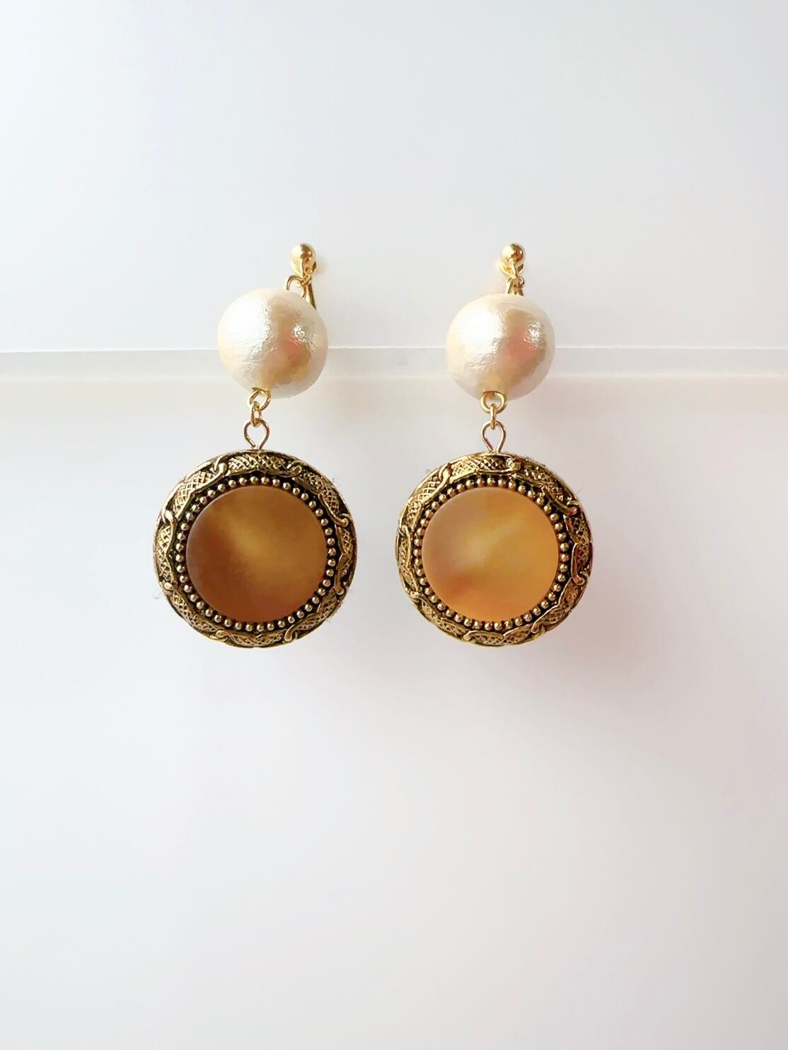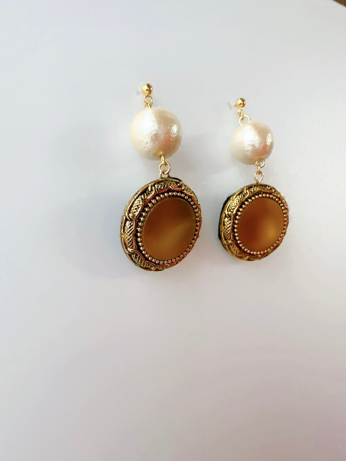 アンティークな雰囲気のボタンパーツとキナリのコットンパールイヤリング・ピアス。