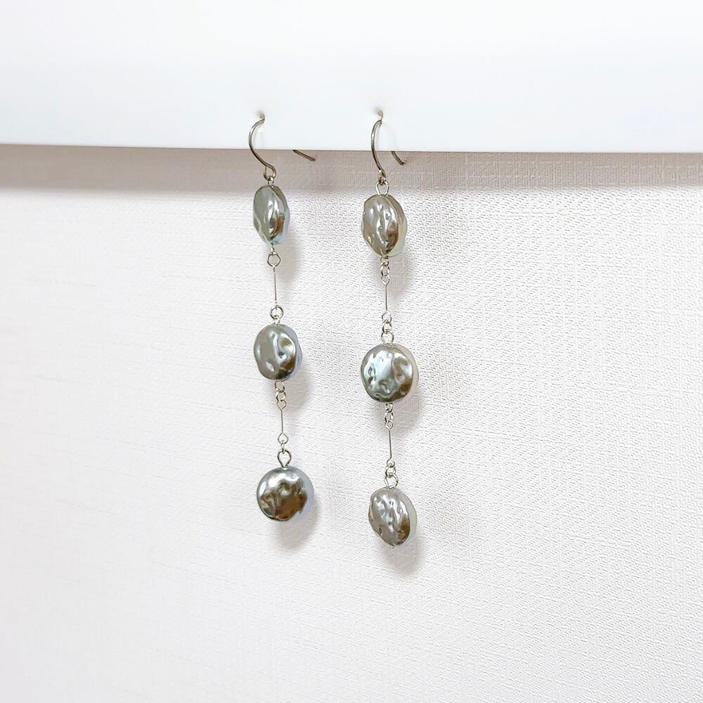 3連コインパールイヤリング・ピアス(グレーパール×ショートタイプ)