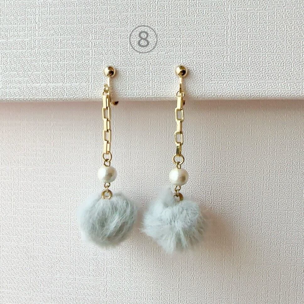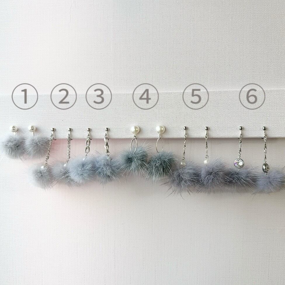 ⑤シルバースクリューチェーンxホワイトツヤパールxライトグレーファーイヤリング